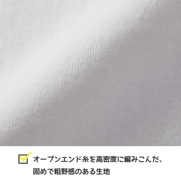 空気を含んだオープンエンド糸を高密度に編み立てたことで、ドライタッチでシャリ感のある肌ざわりを実現。洗い込むほどに粗野な表情が際立ち、縮みや型崩れを抑えたタフな仕上がりが特徴です。シルエットはボックス型で、肩のラインをやや落としたドロップショルダー仕様。袖口には存在感のある2.1インチ幅のリブを備え、縫製はあえて最小限に抑えることで、無駄を削ぎ落としたミニマルなデザインに仕上げています。