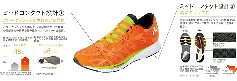 新構造「ミッドコンタクト設計」では7mの高さから落とした卵が割れずに4m以上跳ね返る、ヨネックス独自の衝撃吸収材「パワークッション」を従来品の約6倍の量を中足部~前足部に搭載し、クッション性と反発性を大幅に向上させました。更にランナーの着地軌跡に沿って耐久性とグリップ性の高い発泡ラバーの搭載面積を増大させ、グリップ性を高めました。