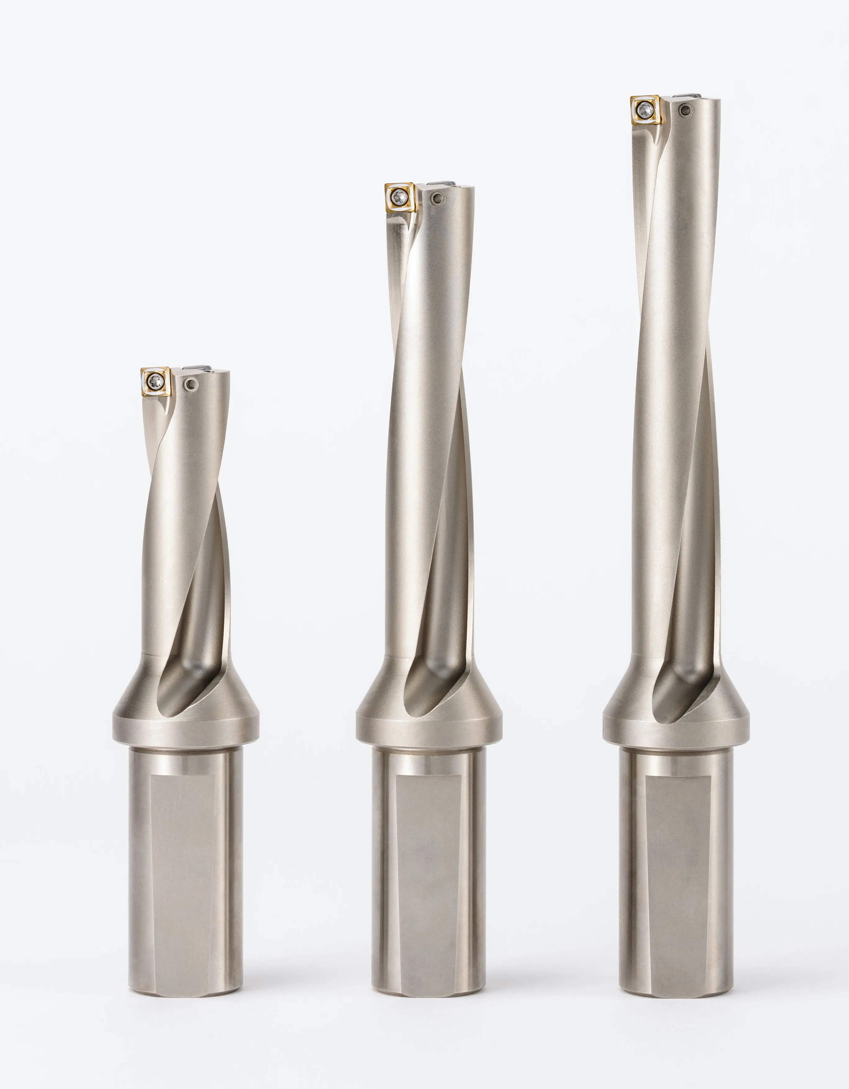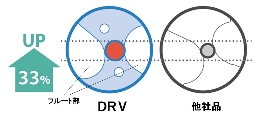 外刃は、切りくずをコンパクトに排出し、切りくずの詰まりを抑制する「U字切れ刃」、内刃は、切りくずを排出する時の摩擦抵抗を低減する「スプーン型切れ刃」とすることで、優れた切りくず排出性を実現。これにより、フルート(溝)部を最適な形状にすることができ、ホルダの芯厚を他社製品に比べ約33%向上(当社調べ)。高剛性・低抵抗の実現により、従来のチップ交換式ドリルでは対応できなかった6Dまでの深穴加工が可能となりました。