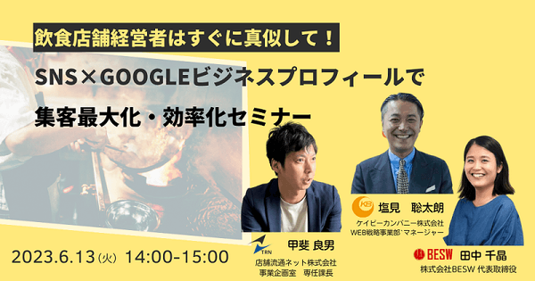 飲食店を中心に20年以上出退店の総合支援を行う店舗流通ネット株式会社(東京都港区:代表取締役社長 戸所 岳大)は、6月13日(火)に株式会社BESW(東京都台東区:代表取締役社長 田中 千晶)とケイビーカンパニー株式会社(大阪府大阪市:代表取締役社長 北島 万乘)とWEBセミナー『飲食店舗経営者はすぐに真似して!SNS×Googleビジネスプロフィールで集客最大化・効率化セミナー』を開催します。
