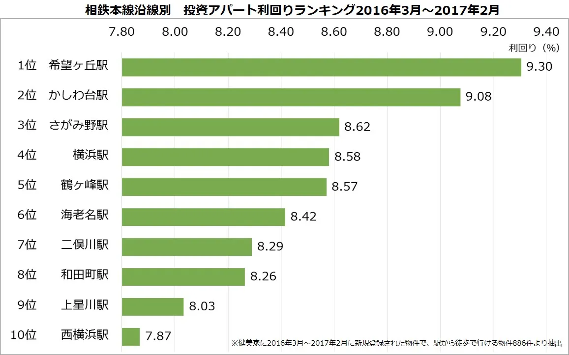 不動産投資と収益物件の情報サイト「健美家(けんびや)」を運営する健美家株式会社(本社:東京都港区、代表取締役社長:倉内敬一)では、同サイトに登録された新規物件を集計し、「相鉄本線沿線駅別アパート投資利回りの平均」の調査結果をまとめましたのでお知らせいたします。