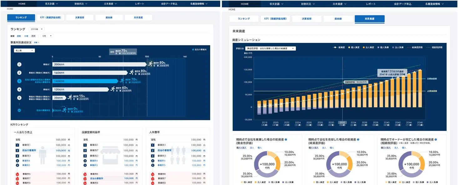 予算管理、KPI&KGI、収支計画(短期・中長期)、資金繰り、ランキング、一株当たり株価、年計表、予実進捗表など様々な数値をタイムリーに把握することができます。