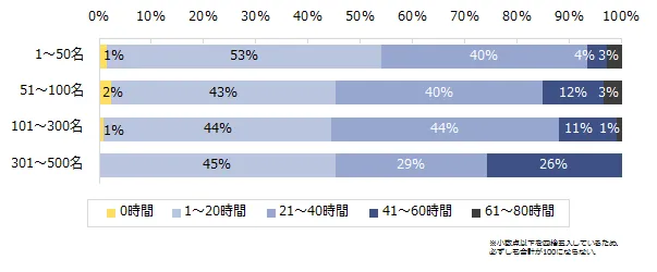 「貴社での1ヶ月の平均残業時間は何時間程度ですか?」と伺ったところ、「41時間以上」(「41時間~60時間」「61時間~80時間」)と回答した企業は12%に留まりました。業種別に見ると、「金融・コンサル関連」は「1~20時間」「21~40時間」のいずれかを回答する結果になっており、他業種に比べて残業時間が少ないことが伺えます。企業規模別に見ると、企業規模が大きい企業ほど「41時間以上」の回答が多く、平均残業時間が多くなる傾向があるようです。