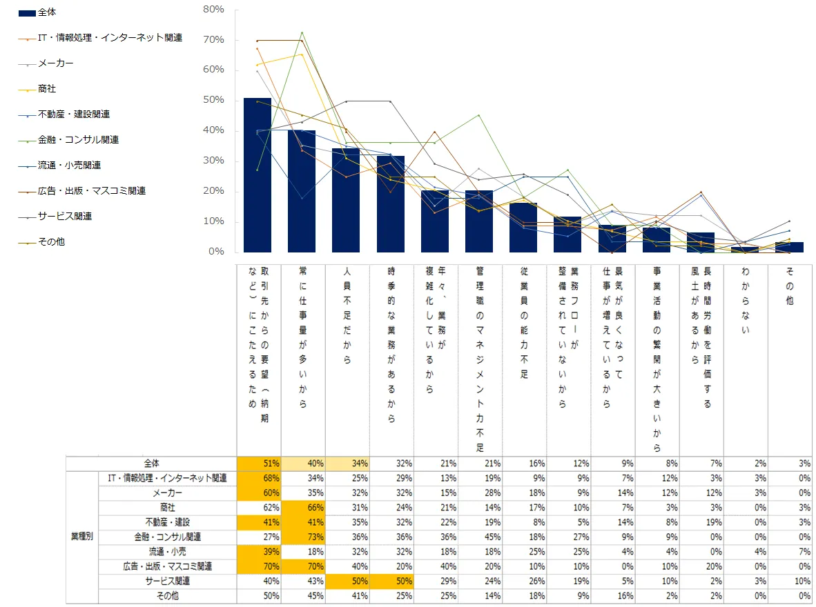 「残業が発生している主な理由は何ですか?」と尋ねたところ、もっとも多かったのは「取引先からの要望(納期など)にこたえるため」(51%)でした。