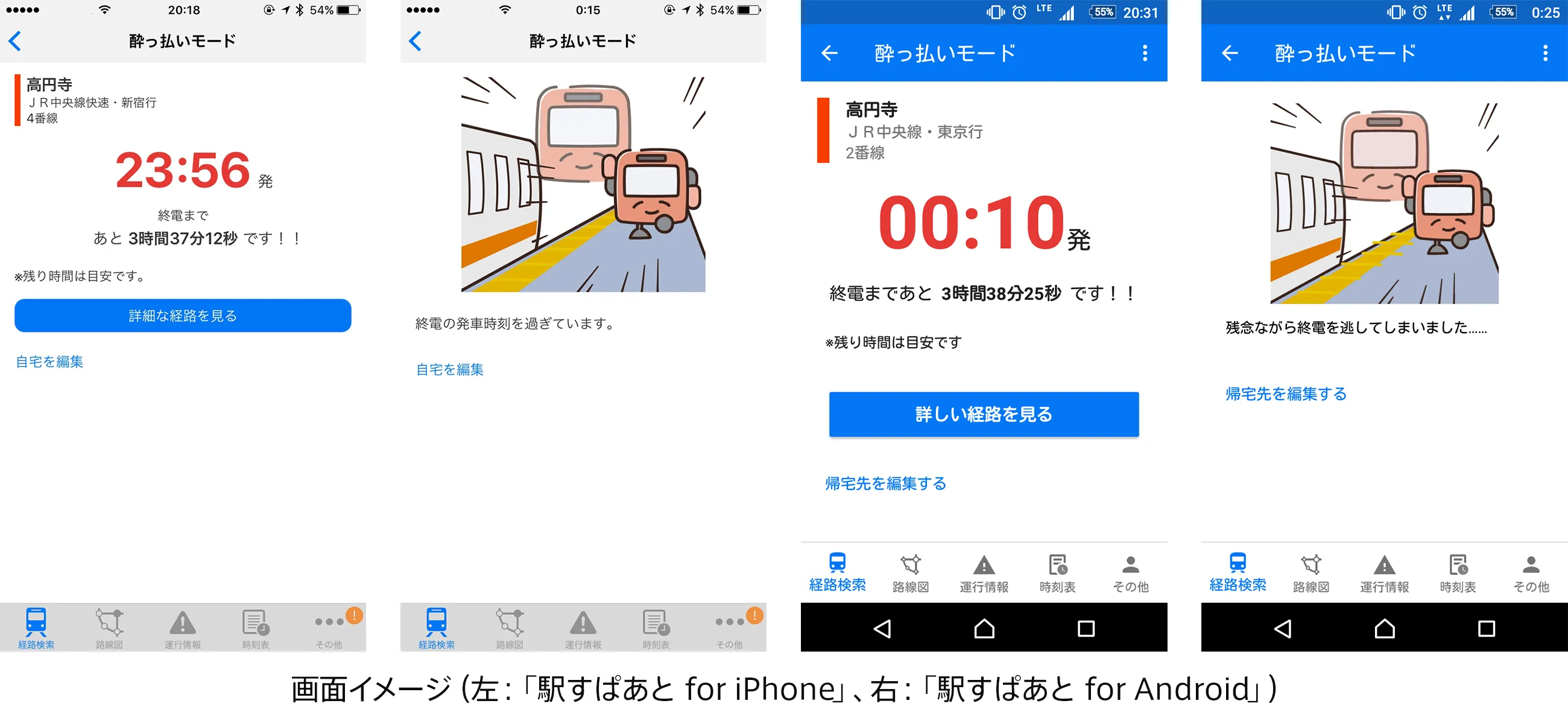 そこで、より多くの“飲み会を楽しみつつ終電までには帰りたい”という方をサポートするため、ヴァル研究所は2017年3月22日(水)、累計700万ダウンロードを突破しているiPhone/Androidアプリ「駅すぱあと」最新版にて、新機能「酔っ払いモード」をリリースします。