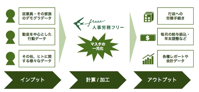 今回、「クラウド給与計算ソフト freee」の機能を大幅に追加し、クラウドで労務管理を一気通貫できる新サービスとして「人事労務 freee」をリリースします。これにより企業は複雑に分断された人事・労務に関する業務を一気通貫させ、従業員データを一元管理、大きく効率化された労務管理が可能となります。
