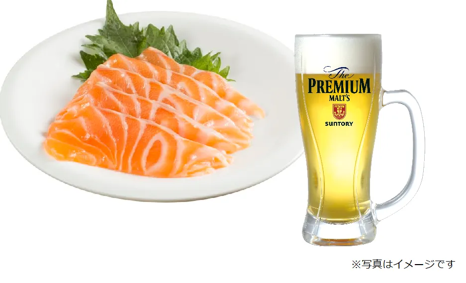 ■内容: ザ・プレミアム・モルツ『生ビール ジョッキ』と『生サーモン刺身盛り』のプレミアムフライデー限定セットとなります。