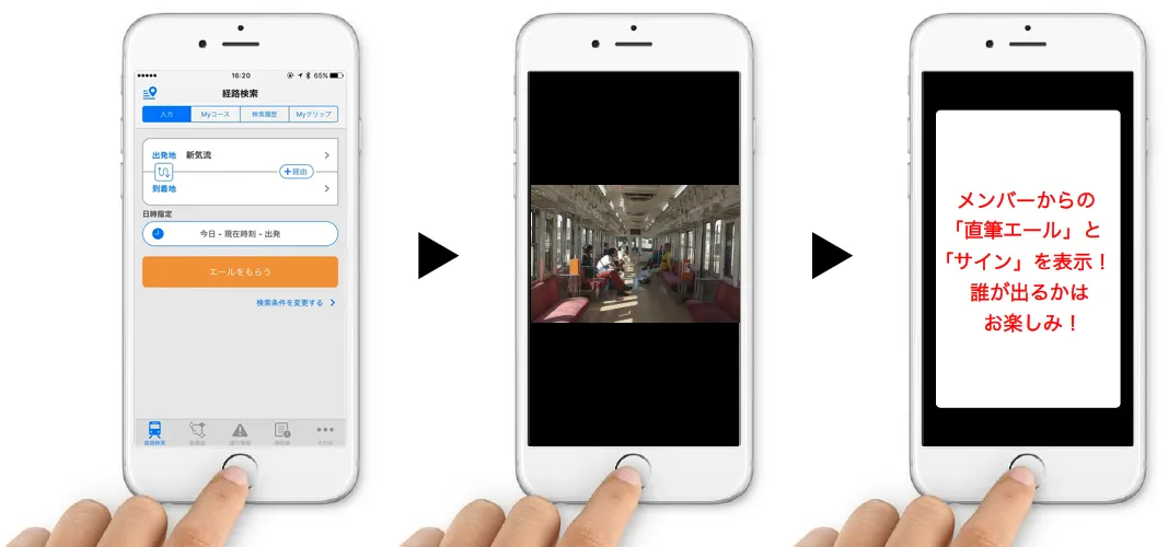 アプリ「駅すぱあと」の経路検索で、出発地に「新気流」と入力すると、ムービー本編の未使用映像と、この春、出発する方に向けた爆弾ジョニーのメンバーからの直筆エールが表示されます。メッセージは全5種類で、いずれもアプリ限定での公開です。