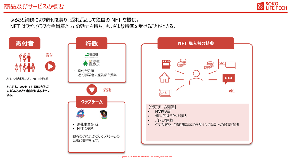 SOKO LIFE TECHNOLOGY では、ふるさと納税の寄付に対して、自治体の特産品やクラブチームのプレミアコンテンツを紐づけて、返礼する事業を提案しております。