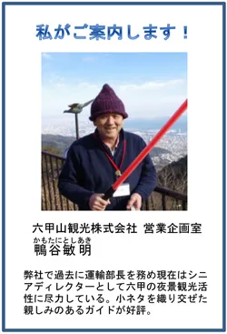 六甲山上にある夜景スポットをガイドスタッフと巡り、六甲山から見える景色や夜景の楽しみ方を紹介するツアーです。