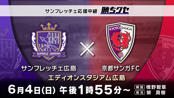 広島ホームテレビ(HOME:本社・広島市中区)は、6月4日(日)ごご1時55分から、「サンフレッチェ応援中継 勝ちグセ サンフレッチェ広島対京都サンガF.C.の試合を生放送します。
