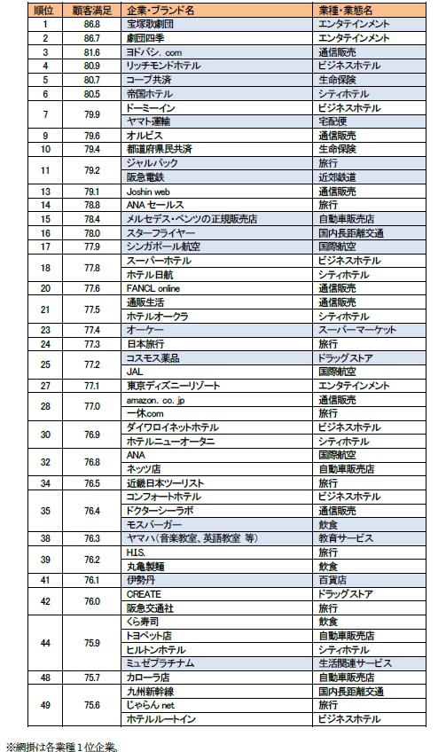 2016年度に調査を行った31業種の正規調査対象企業の中で、「顧客満足」が高く評価された上位51社(49位まで)です。旅行業種の企業・ブランドが8社ランクインし、最も多くなりました。