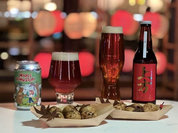 当イベントでは、ご近所さんのたこ焼きとクラフトビールを「みやぐりん」でふるまいます。たこ焼き発祥のお店「会津屋」の職人が目の前で焼き上げる、できたてアツアツのたこ焼きは絶品。ソースや青のり、紅ショウガを一切使用しない「元祖たこ焼き」と、たこ焼きのもとになった、たこの代わりに肉やこんにゃくを入れる「ラヂオ焼き」の2種類を、秋を感じさせる食用のもみじを添えて提供します。また本イベントでは秋限定で販売されるメープルシロップのような甘さと酸っぱさを兼ね備えたクラフトビールと、秋らしい琥珀色のクラフトビールの2種類を用意。だしの効いたたこ焼きとも相性抜群です。