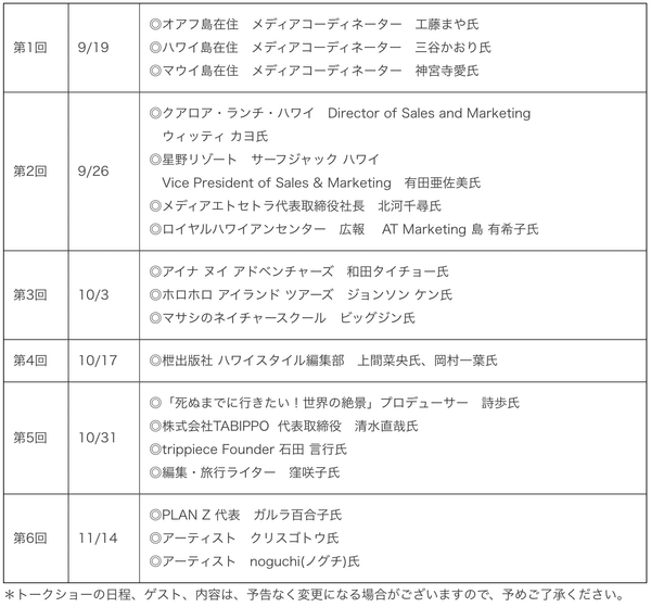 第3回(10/3)は、ハワイ島の名物ガイド3名によるハワイ島の魅力、第4回(10/17)は、ハワイ専門誌の編集部による取材裏話、第5回(10/31)は、世界一周をした旅人がすすめるハワイ、第6回(11/14)では、ハワイで活躍するアーティストらが登壇します。毎回ディープなハワイ情報をハワイ州観光局日本支局長がゲストと共に発信します。