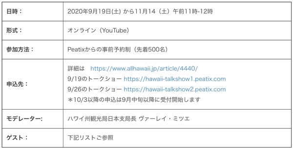 同トークショーでは、ハワイ観光再開までの間、よりリアルなハワイの状況をお届けするために、様々なゲストを毎回お招きします。初回のトークショー(9/19)では、オアフ島、ハワイ島、マウイ島在住のメディアコーディネーター3名が各島の状況について、第2回(9/26)では、ハワイ旅行に欠かせない、オアフ島のホテル、アトラクション、ショッピングモール、レストランからハワイ在住の4名がオアフ島の現状や各施設の状況について紹介します。