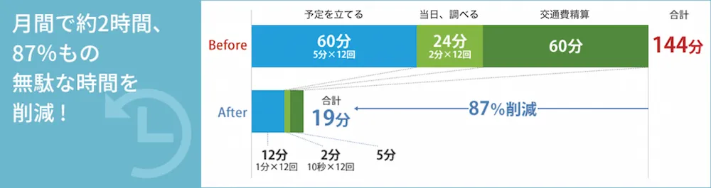「RODEM」は訪問先をカレンダーに登録するだけで、スケジュール調整・経路検索・交通費精算が済み、作業時間を大幅に削減できるビジネス・サポートサービスです。従来約2時間かかっていた経路検索から精算までの作業時間を、87%ほど削減することができます。