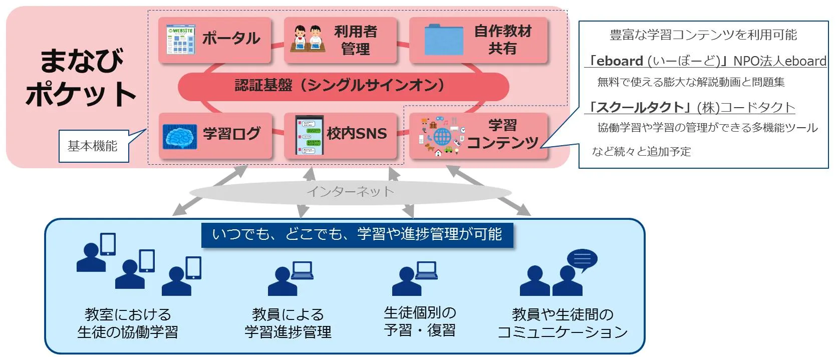 「まなびポケット」は、様々なデジタル教材やコミュニケーション機能などを、児童生徒や教員、保護者などがいつでもどこでも利用できるようにするコンテンツ提供プラットフォームです。
