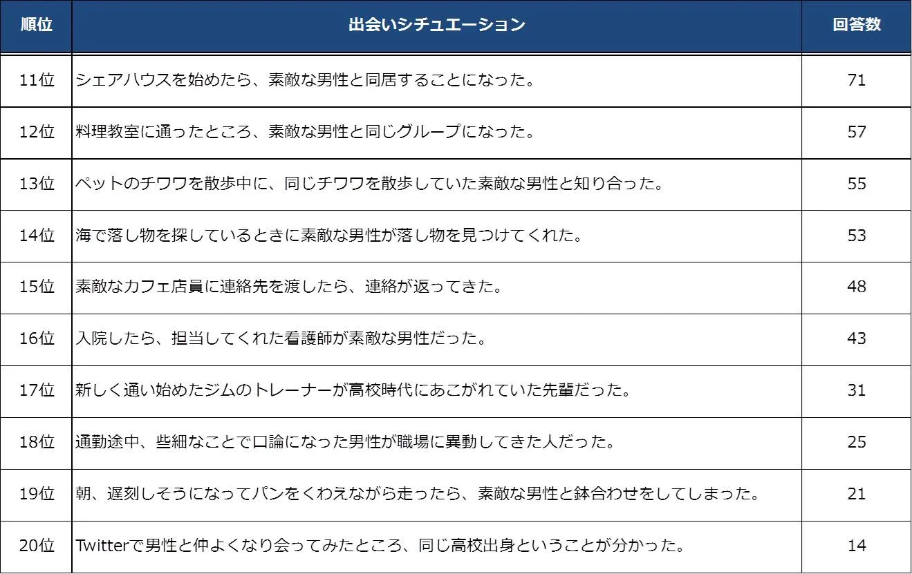 一方で、11位以下に選出されている出会い方では、シェアハウスという現代のライフスタイルならではの場所での出会いから、習い事やジムといった質の高い生活を求めた場所での出会い、そして、SNSの発達によってランクインした「Twitter」からの出会いと、現代人ならではのコミュニケーション手法やライフスタイルの変遷によって選出されたシチュエーションが選出された。