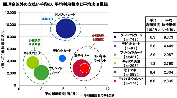 ≫ キャッシュレス決済手段の使い分け クレジットカードの平均決済単価は9,373円、電子マネーは2,804円