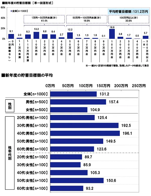 続いて、全回答者(1,000名)に、新年度の貯蓄目標額を聞いたところ、「0円(目標額なし)」が9.1%、「1万円~50万円未満」が41.4%、「50万円~100万円未満」が16.9%、「100万円以上」が30.6%となりました。1年で100万円以上の貯蓄をしたいと考えている人が3割いるようです。また、0円との回答も含めた平均貯蓄目標額は131.2万円となりました。
