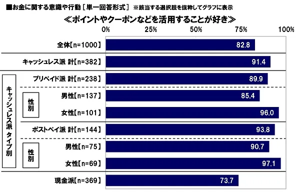 全回答者(1,000名)に、お金に関する意識や行動について質問し、キャッシュレス化状況(現金離れ状況)やキャッシュレスの支払い手段で分けた各タイプで比較したところ、「ポイントやクーポンを活用することが好き」では、キャッシュレス派が91.4%、現金派が73.7%、「個人型確定拠出年金(iDeCo)に関心がある」では、キャッシュレス派が27.0%、現金派が10.6%で、どちらもキャッシュレス派の割合が現金派よりも高くなりました。また、キャッシュレス派の中でも、ポストペイ派がそれぞれ93.8%、29.9%となり、プリペイド派(89.9%、25.2%)よりも高くなりました。キャッシュレス派、特にポストペイ派は、ポイントやクーポンなどの活用が好きで、今年から加入対象者が大幅に拡張されたことで注目を集めている個人型確定拠出年金(iDeCo)に関心がある人が多いようです。ポストペイ派は特に、“お得情報に敏感”なのではないでしょうか。