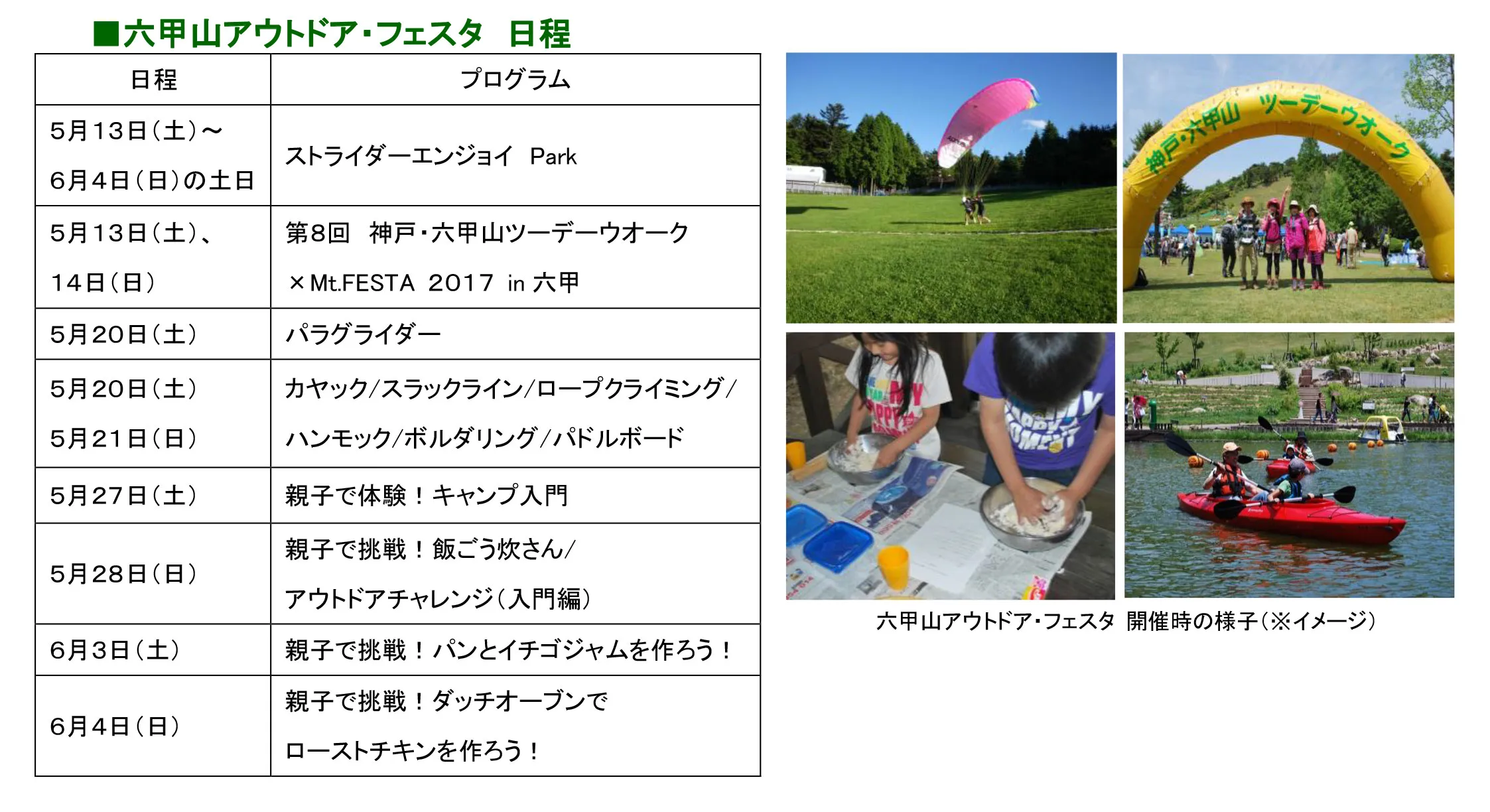 今年で三回目を迎える、お子様に大人気の「ストライダーエンジョイ Park」をはじめ、六甲山で浮遊感を体験できる「パラグライダー」や、ペアで楽しめる「カヤック」、ロープの上でジャンプなどの技を決める話題のスポーツ「スラックライン」などの様々なスポーツ体験イベントを行います。また、自然の中で気軽に親子で体験できるイベントとして、「カレー」や「ローストチキン」、「パンとイチゴジャム」などを作るアウトドアクッキングも開催します。