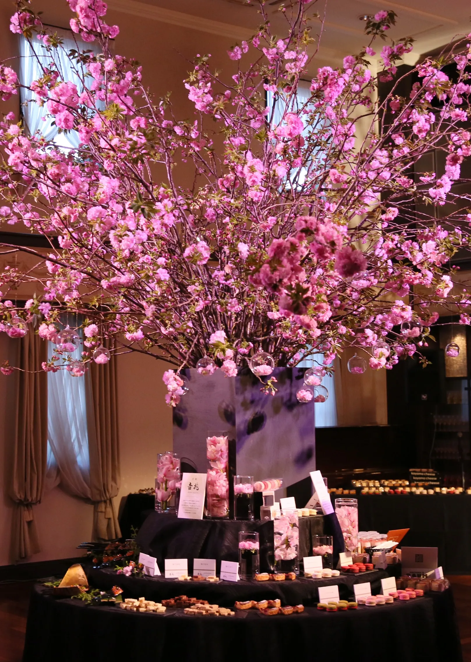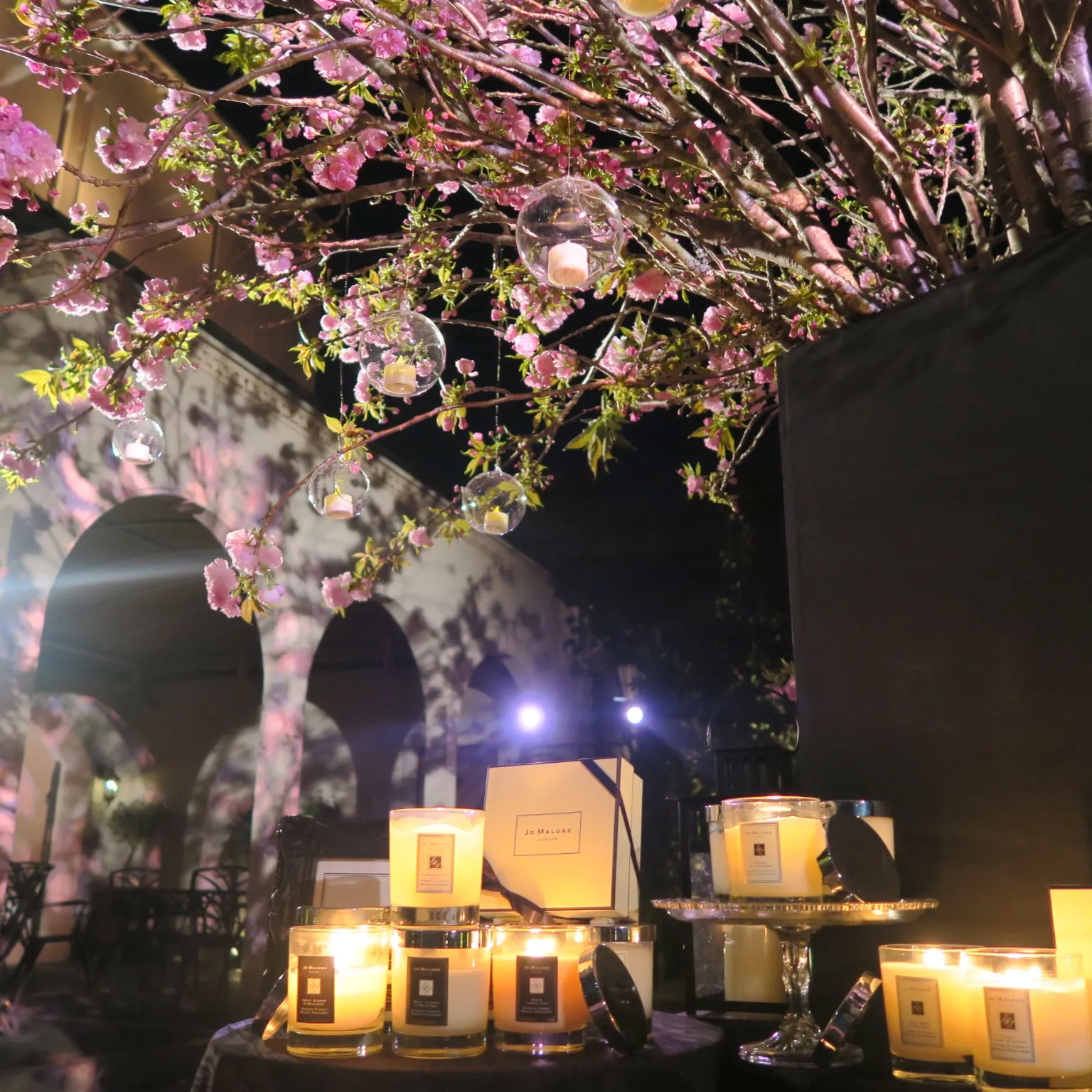 会場内にはダイナミックな桜の活け込みや、ピンクと白のバラ、紫陽花とグリーンという、異なる雰囲気のお花でデザインされたフラワーウォールなどの華やかなしつらえで、京都の美しい春を最大限に表現。さらに今回はエレガントで洗練されたデザインと独創的な香りが人気のロンドン発祥のラグジュアリーライフスタイルブランド「Jo Malone London」にご協力いただき、入り口に香り豊かなキャンドルを配して皆様をお出迎えし、女性が五感で楽しめる空間を演出いたしました。