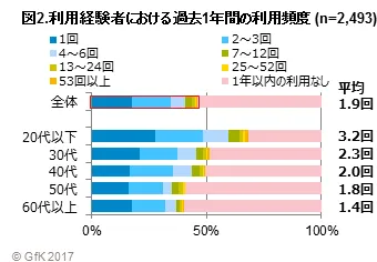 ・利用経験者の46%が過去1年間で1回以上利用。年代が低くなるほど利用頻度は上昇