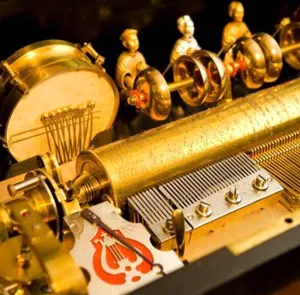スイスで時計産業が発達する中、1796年に時計職人のアントワーヌ・ファーブルは懐中時計や小物の中に組み込む小さな音楽装置を発明しました。これがオルゴールの誕生と考えられています。19世紀には、スイスの技師たちによって、オルゴールの演奏技術は発展を遂げます。演奏家がいなくても美しい音楽が楽しめる楽器として、オルゴールが盛んに作られていました。