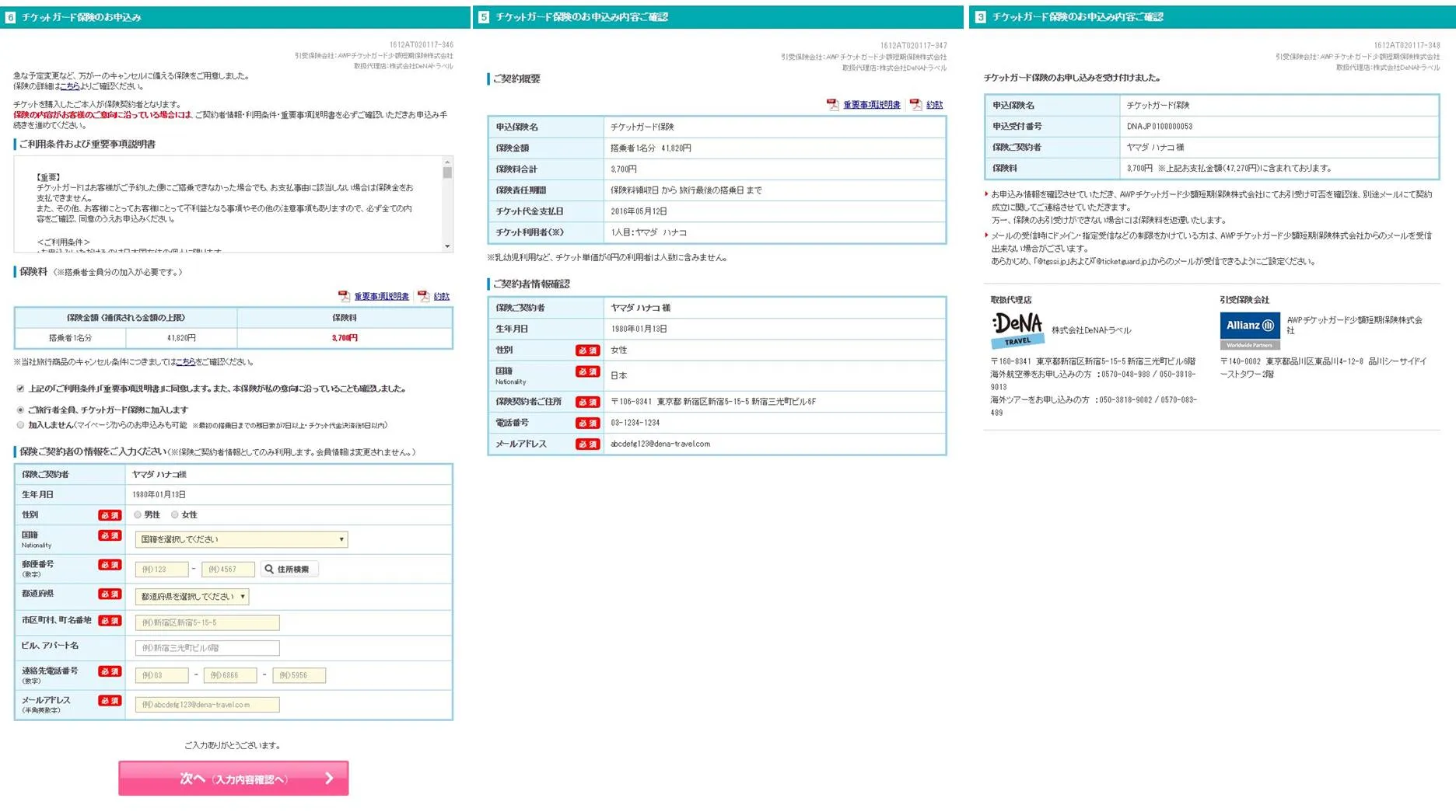 (左より)チケットガード保険「入力ページ」「確認ページ」「完了ページ」
