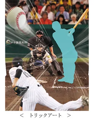 2月23日(木)から企画展示コーナーに登場した「トリックアート」のデザインを変更し、本企画展の開催に合わせてプロ野球バージョンとします。甲子園球場のバッターボックスに立って、藤浪晋太郎投手の剛速球を打ち返しているかのような写真を撮ることができます。