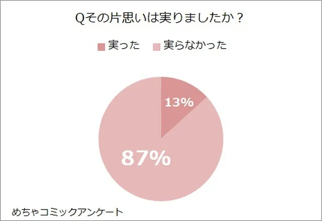 「実った」と答えたのは13%。大多数の人が実らずにして散ってしまったか、あるいはまだ気持ちを捨てられずに、苦しい片思いを続けているようです。