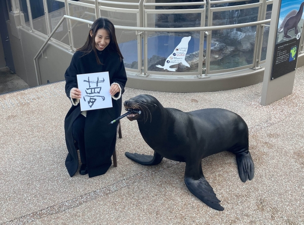 手に持った色紙にアシカが書き上げる、「「アシカの一筆入魂!」を開催いたします。その場で「辰」・「笑」・「海」など、約10種類の文字の中からお好きな一文字を選んでいただき、目の前でアシカの力強い筆さばきをご覧いただけます。