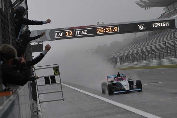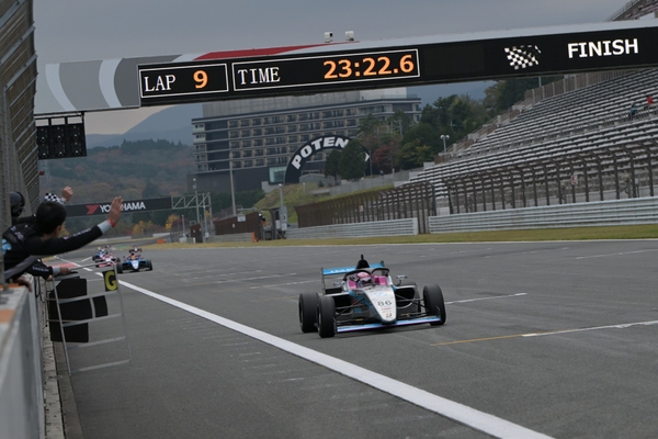 翌周のパナソニック オートモーティブコーナーでは、9番手の山本がコースオフを喫する痛恨のミス。入賞圏内を争っていた細川が9番手、白石が10番手に順位を上げた。一方、隊列先頭では下野が好ペースで周回を重ね、独走状態でレースは12周目に突入。最終的に約9.4秒のギャップを築いて今季8勝目を飾り、フォーミュラ初年度の最終レースをトップで締め括った。2位は翁長、3位は斎藤となり、9位でレースを終えた細川は今季初入賞を果たしている。