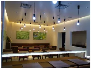 店内は、「現代の茶室」をコンセプトに、白・黒・木などシンプルな素材感を活かし、茶花アートワークを飾り、日本の和や四季の移り変わりを演出しています。