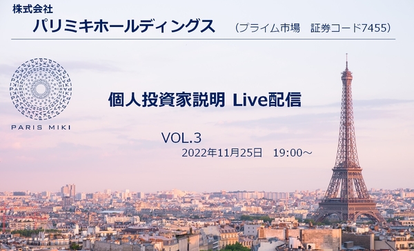 「パリミキ」を展開している株式会社パリミキホールディングス(本社:東京都港区、代表取締役社長:澤田将広)は、ログミー株式会社が提供する、投資家と上場企業との新たな出会いや相互理解を促進し、投資機会を創出するプラットフォーム「logmi IR Live」のトライアル運用に参加しております。