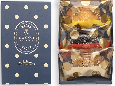 内容:しっとりマドレーヌココン(プレーン、ベルギーチョコレート、ロイヤルミルクティー)×各1個