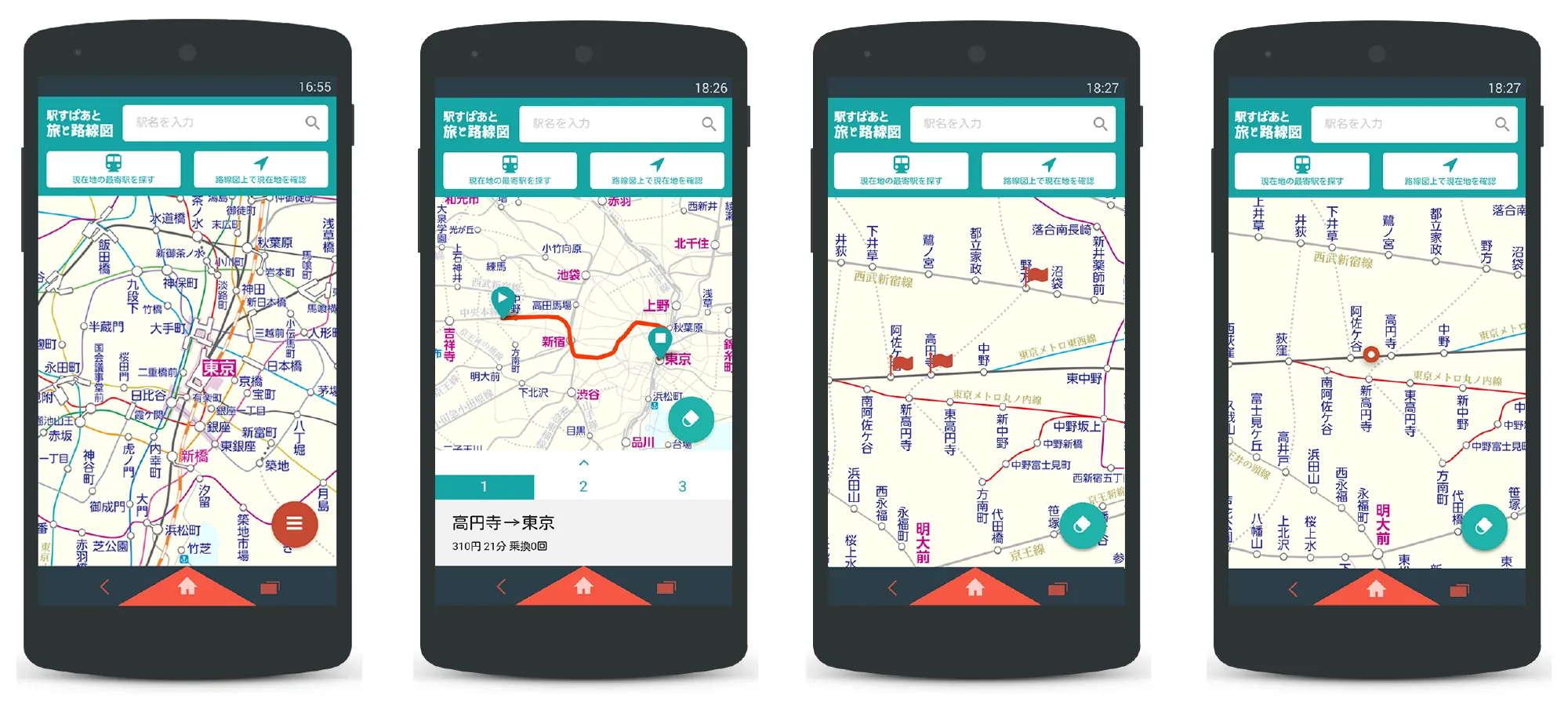 2017年4月4日(火)の初回リリース時点では「経路検索」「路線図で現在地を確認」「現在地の最寄り駅を探す」「路線塗りつぶし」「路線選択」の5つの機能を備えています。