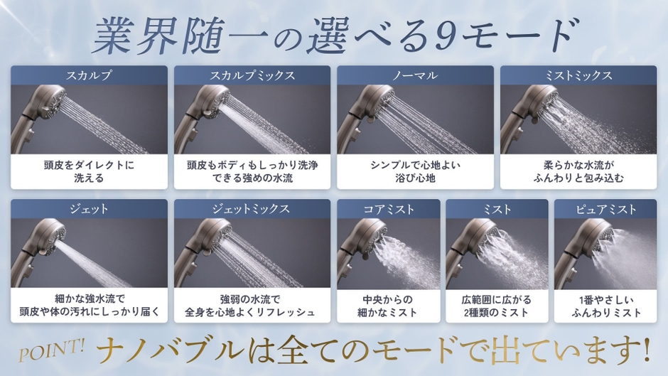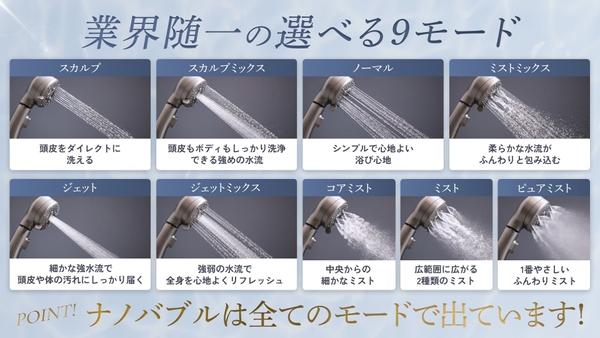頭皮をリフレッシュするスカルプモード、リラックスしたいときに最適なミストモード、全身をすっきり洗い流すジェットモードなど目的に合わせて選べる9種類の水流モードを搭載。さらに、全モード共通でナノバブルを生成し、毛穴の奥まで汚れを浮かせて除去します。気分や用途に合わせて水流を変えることで、毎日のシャワーが「癒しの美容タイム」に変わります。