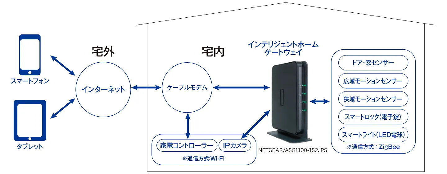 「インテリジェント ホーム ゲートウェイ」と各種デバイスを組み合わせることで、家の中を自由自在にコントロールすることができます。利用用途に合わせてデバイスを自由にお選びいただけます。