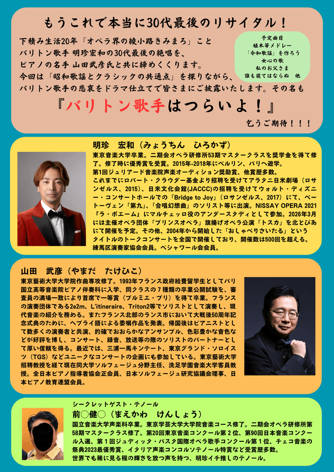 歌を始めた原点は昭和歌謡だと常々語っている明珍が大切にしてきた昭和歌謡と、クラシック音楽の共通点を明珍の最大の理解者である山田武彦氏と共に探りながら紐解いていきます。
