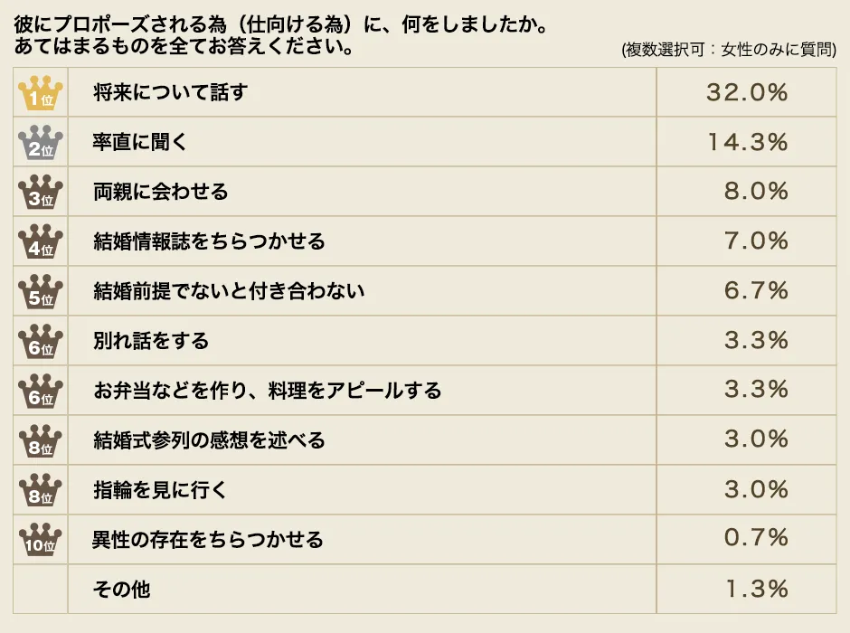 (3.0%)、同8位「指輪を見に行く」(3.0%)、10位「異性の存在をちらつかせる」(0.7%)と続きました。