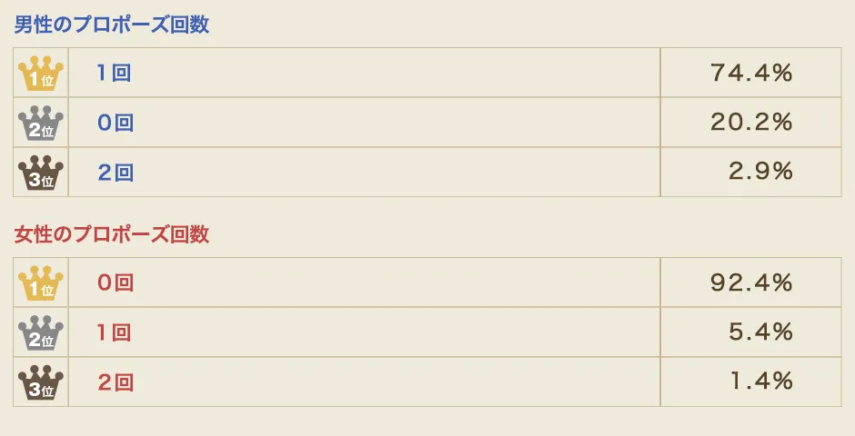 最初にご覧いただくのは「プロポーズをした回数」。早速、男女別に見ていきましょう。