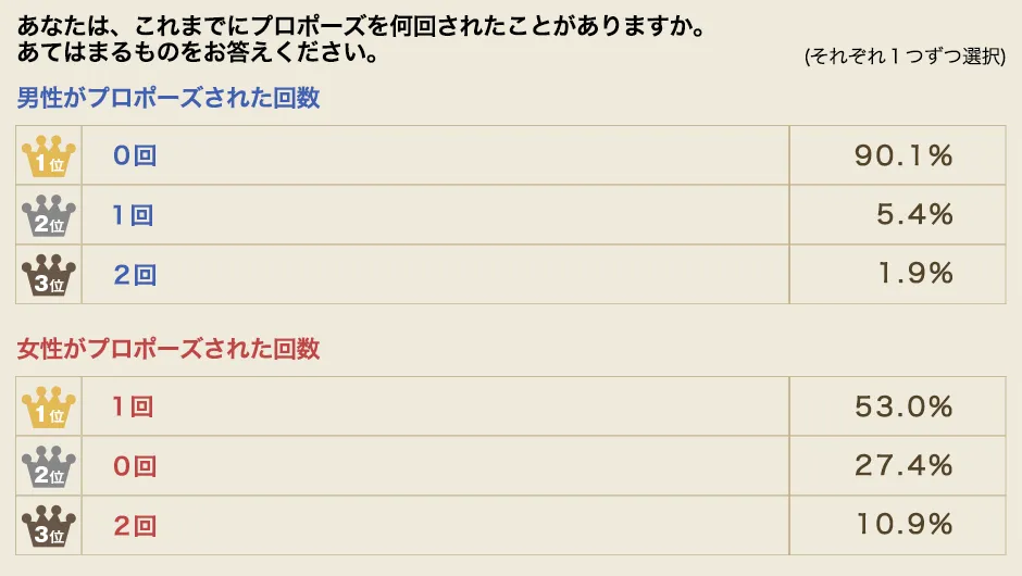 一方、男性で1回以上プロポーズされた経験者が合計7%以上いることを多いと見るか、少ないと見るか…プロポーズもまた、時代と共に様変わりしていくのかもしれません。