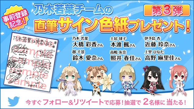 応募方法:開催期間中に『ゆゆゆい』公式Twitter ( @yyyi_game ) をフォローし、キャンペーン対象のツイートをRTしてくれた方の中から抽選で、「乃木若葉チーム集合サイン色紙」を2名様にプレゼントいたします。