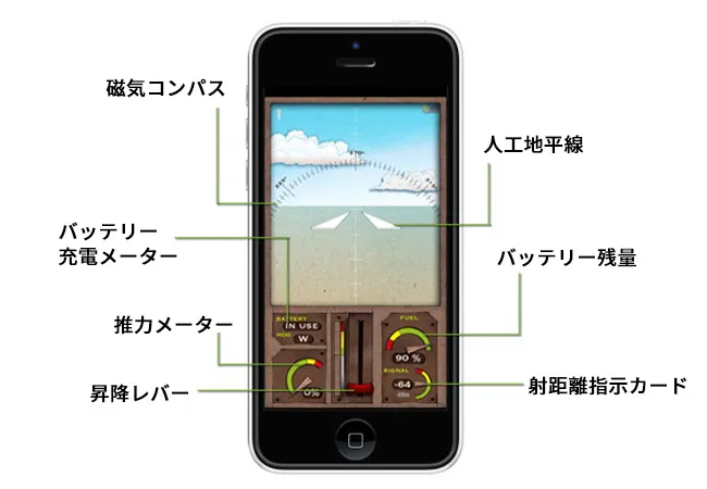 4.飛ばす…スロットルをいっぱいに押して紙飛行機を空高く飛ばしてください。あとはスマートフォンを左右に傾けたり、昇降レバーを上下して操作してください。
