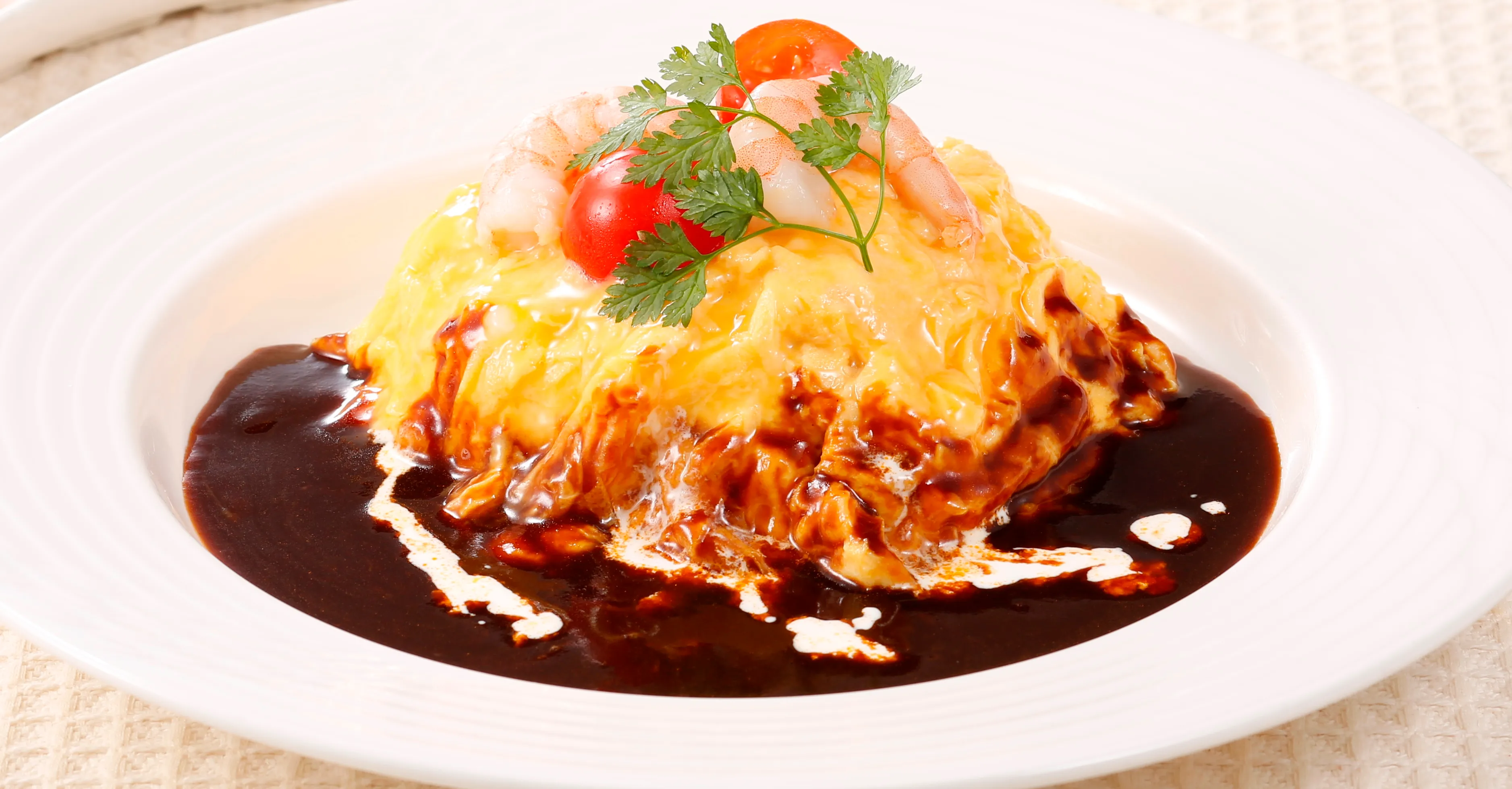 とろとろ卵に海老とミニトマトをトッピングし、肉と野菜の旨みの効いたデミグラスソースのオムライスです。ケチャップライスとよく合います。