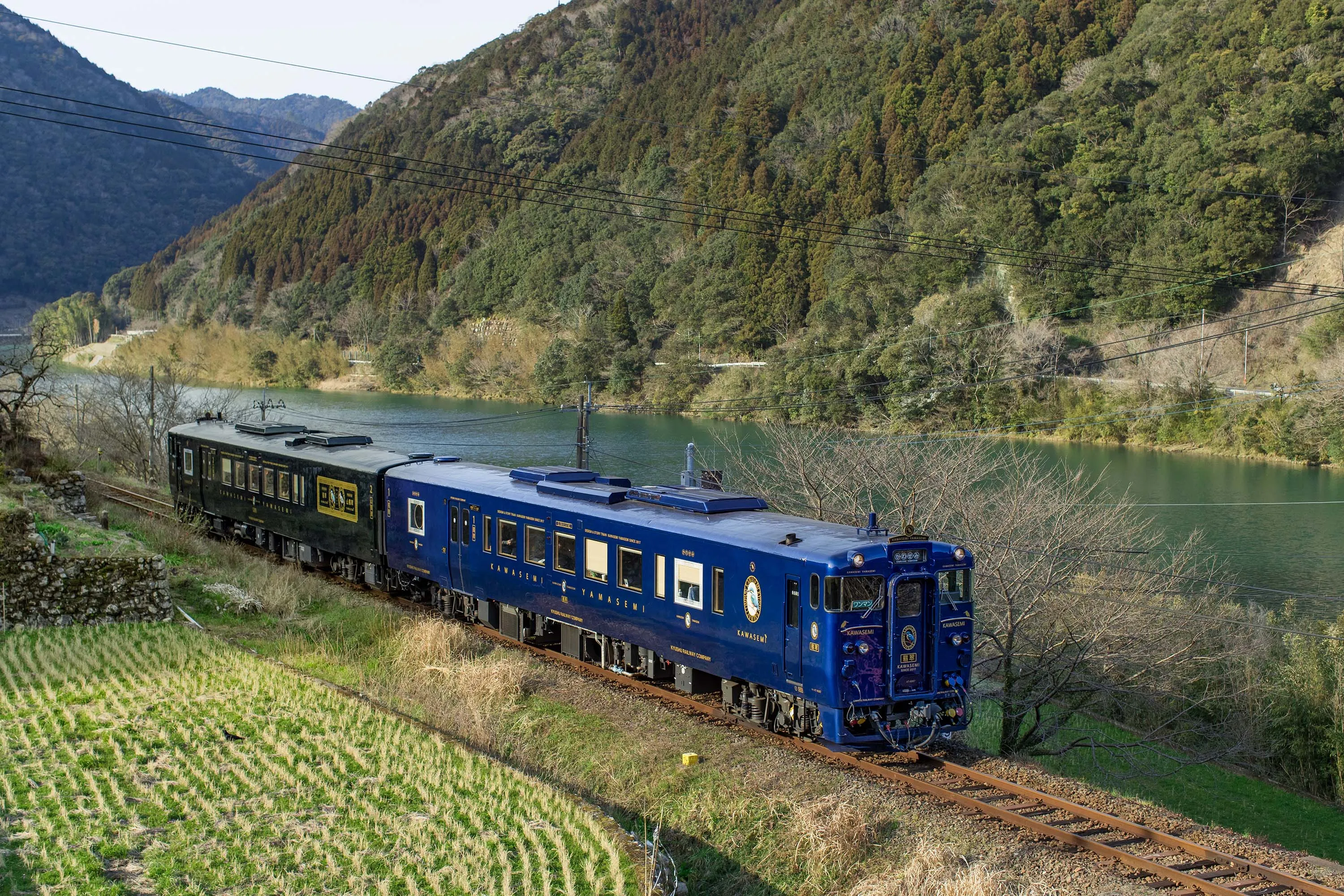 球磨川流域に棲む野鳥「翡翠(かわせみ)」「山翡翠(やませみ)」から命名された「かわせみ やませみ」は、2017年3月4日、熊本~人吉間で運行開始しました。四方を深い山々に囲まれた人吉盆地を走るD&S列車(デザインとストーリーのある列車)で、車内は景観に合うよう人吉球磨産の檜や杉を使い、温かみのある内装に仕上げています。