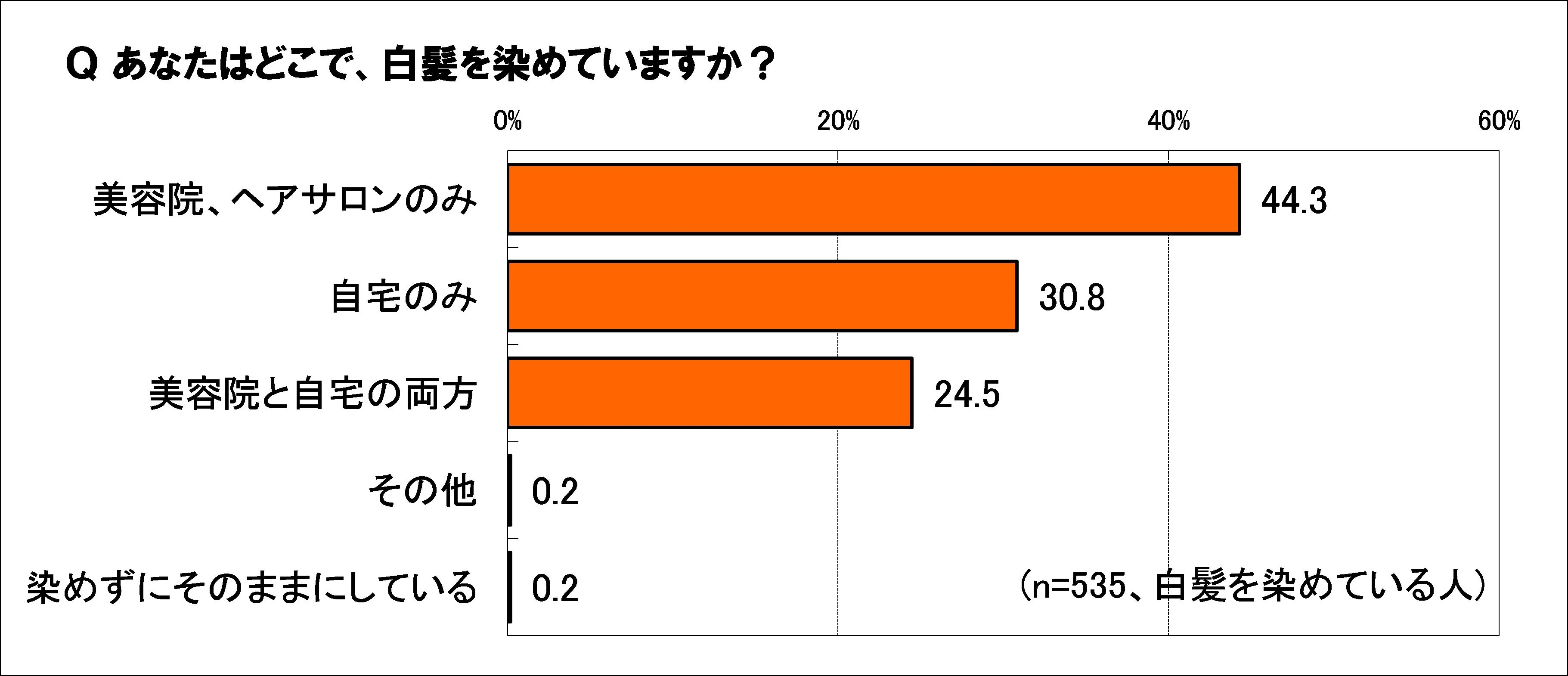 そんな今、白髪が気になりだした女性が白髪染めをするのは美容院か自宅か? その頻度は? 場所については、「美容院、ヘアサロンのみ」44.3%、「自宅のみ」30.8%、「美容院と自宅の両方」24.5%という結果に。55.3%の人が、自宅で市販の白髪染めを使っているということになります。頻度は「美容院」でいちばん多かったのが「2ヶ月に一回」で30.2%、「自宅」の1位は「1ヶ月に1回」35.1%でした。