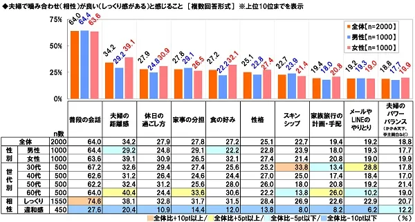 男女別にみると、女性では「夫婦の距離感」が39.1%、「食の好み」が32.1%となり、男性(「夫婦の距離感」29.2%、「食の好み」22.2%)と比べてどちらも9.9ポイント高くなりました。お互いの距離感や食の好みに相手との噛み合わせの良さを感じているのは、男性より女性のようです。